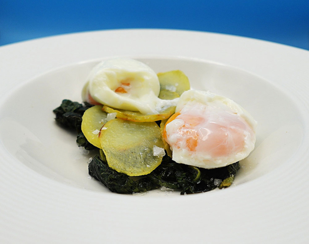 15. Poner encima dos huevos mollet templados dentro de un cazo con agua caliente.