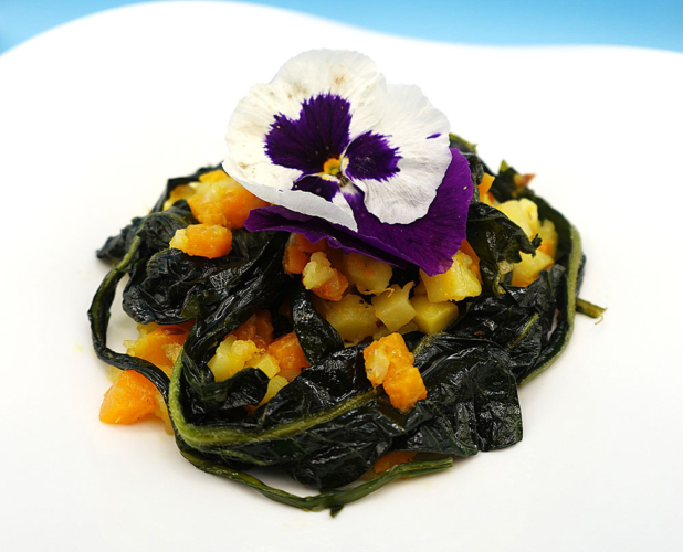 - Colocar un montoncito del guiso de patata con calabaza bien escurrido en el centro del plato.