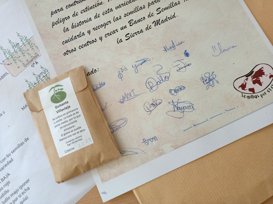 ¡Aquí empieza la misión, y es una misión muy importante! La pérdida de biodiversidad agrícola es un problema al que nos enfrentamos como sociedad y es fundamental trabajar entre todos/as para reducirla. Cada clase se comprometerá a custodiar una variedad tradicional de la sierra de Madrid, variedades de semillas ‘en peligro de extinción’. En esta primera sesión se les hace entrega del ‘contrato de guardianes de semillas’ y las semillas de su variedad, comprometiéndose el grupo a conocer la historia de esa variedad tradicional, aprender a sembrarla, a cuidarla y a recoger las semillas en otoño para nutrir el futuro Banco de Semillas Interescolar de la Sierra de Madrid, uno de los objetivos del proyecto.