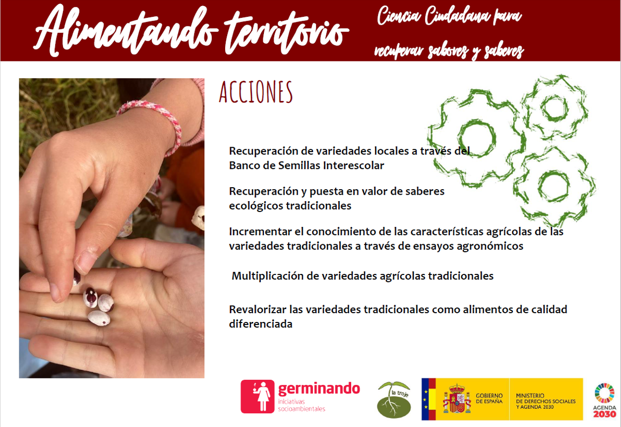 El proyecto “Alimentando territorio: Ciencia ciudadana para recuperar sabores y saberes” pretende contribuir al desarrollo rural a través de la revalorización de la biodiversidad agrícola de la Sierra de Madrid, mediante la recuperación y puesta en valor de variedades tradicionales y saberes tradicionales, así como la mejora del conocimiento acerca de estas variedades en lo relativo a sus características ecológicas, productivas y potencial culinario. Se realizará en centros educativos de primaria y FP, dando continuidad al proyecto “Semillas por el clima” financiado también por el Ministerio en 2021.