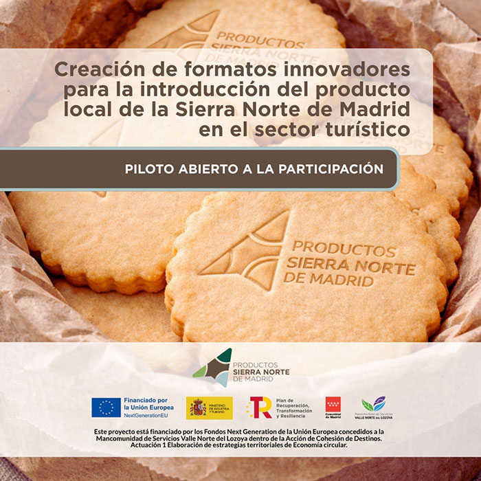 El proyecto Creación de formatos innovadores para la introducción del producto local de la Sierra Norte de Madrid en el sector turístico está financiado por los Fondos Next Generation de la Unión Europea concedidos a la Mancomunidad de Servicios Valle Norte del Lozoya dentro de la Acción de Cohesión de Destinos. Actuación 1 Elaboración de estrategias territoriales de Economía circular.