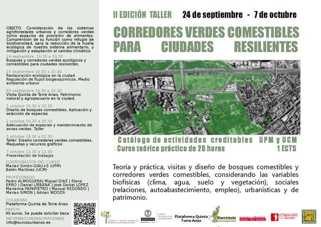 El curso incluye visitas, exposiciones teóricas y el trabajo sobre uno de los espacios más singulares desde el punto de vista de la innovación agroecológica de la ciudad de Madrid: la Quinta de Torre Arias. A lo largo del taller se trabajará en una propuesta concreta de definición de estrategias urbanas de desarrollo de bosques comestibles y corredores verdes alimentarios, considerando las variables físicas (clima, agua, suelo y vegetación), urbanísticas y de patrimonio y sociales (relaciones, abastecimiento, empleo).