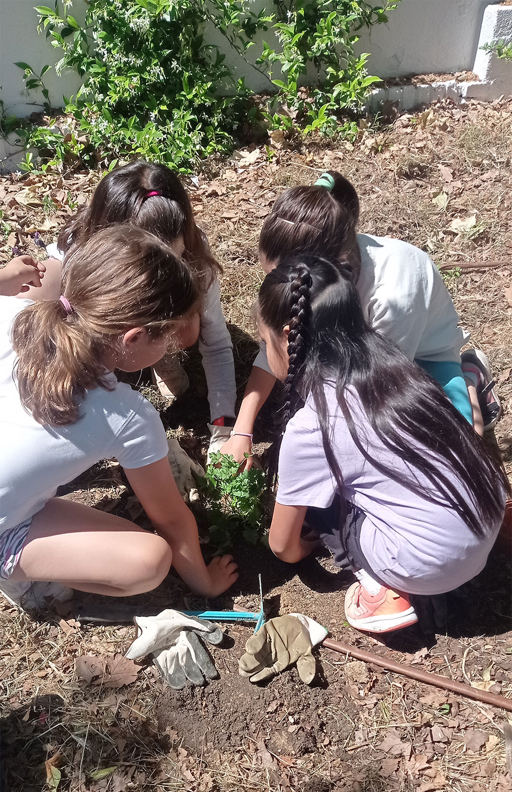 Los cursos de los más pequeños exploraron el huerto con lupas de exploradores, fabricaron pulseras primaverales con elementos naturales y descubrieron los detalles más minuciosos del entorno. Los mayores, por su parte, aprendieron a usar herramientas grandes de manera correcta y segura, aplicando sus conocimientos en un proyecto de restauración ecológica de una zona del colegio. Plantaron jaras, lavandas y otros arbustos, ayudándolos a resistir el verano mediante la modelación del terreno.