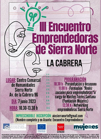La III Feria de Emprendedoras de la Sierra Norte de Madrid reúne proyectos empresariales creados y gestionados por mujeres que viven en alguno de sus municipios. Organizada por la Mancomunidad de Servicios Sociales Sierra Norte, el encuentro incluye un taller sobre redes sociales para emprendedoras a cargo de Mariley Torres Santana, de la Fundación Mujeres, y un espacio de networking a partir de las 12.30 horas. Estaremos ofreciendo información sobre la Oficina de Apoyo y Consolidación al Emprendimiento.