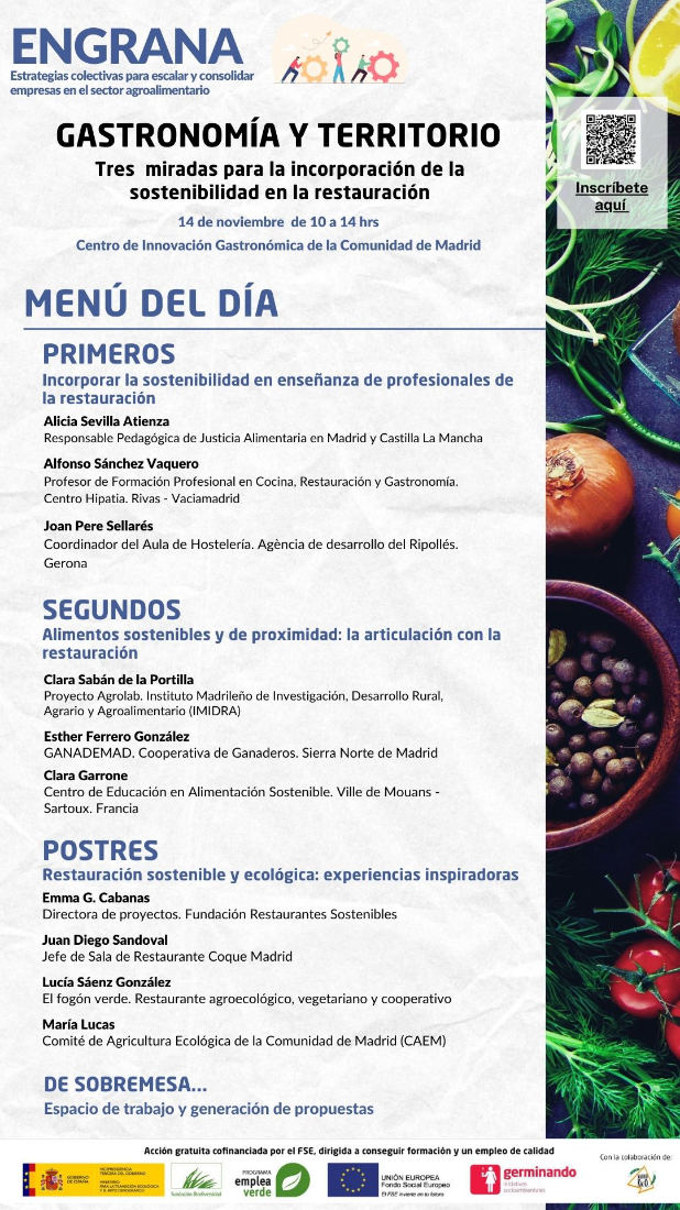 El próximo lunes 14 de noviembre celebramos la última acción del programa Engrana, el encuentro ‘Gastronomía y territorio. Tres miradas para la incorporación de la sostenibilidad en la restauración’. La cita será en en el Centro de Innovación Gastronómica de la Comunidad de Madrid de 10.00 a 14.00 horas y es totalmente gratuita.