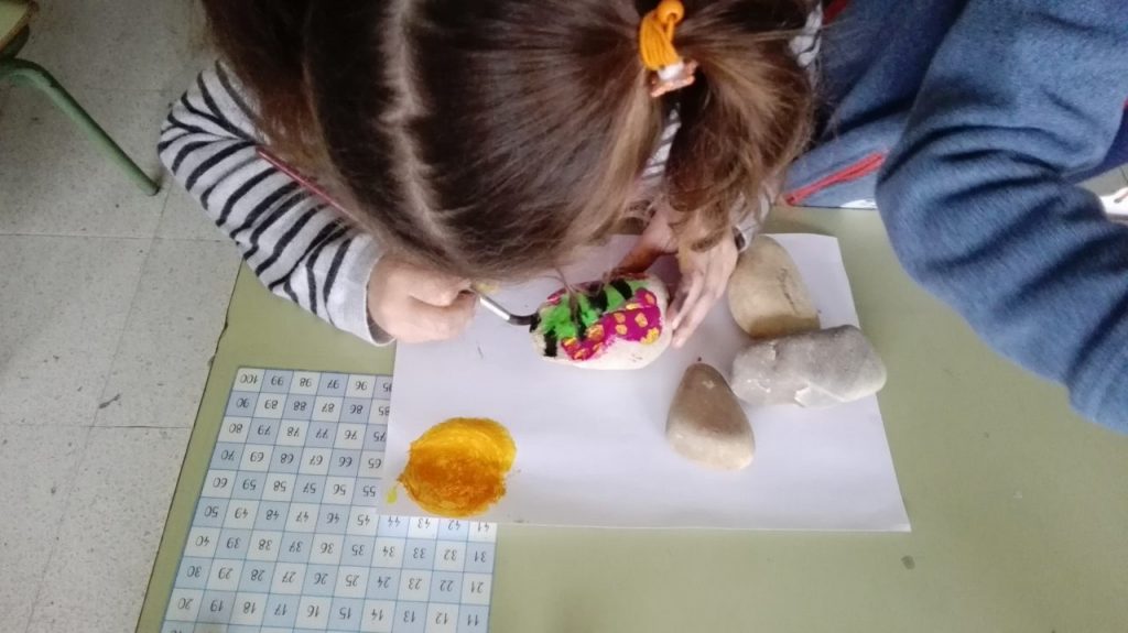 En otros coles cosechamos las lechugas, vimos aparecer los ajos y guisantes, buscamos fotos de las verduras por el huerto, jugamos al twistter y también al memory de verduras. También visitamos el hotel de insectos para ver las mejoras que hay que hacer tras las ultimas lluvias, y  pintamos piedras para decorar los alrededores del hotel de insectos. ¡Quedaron genial!