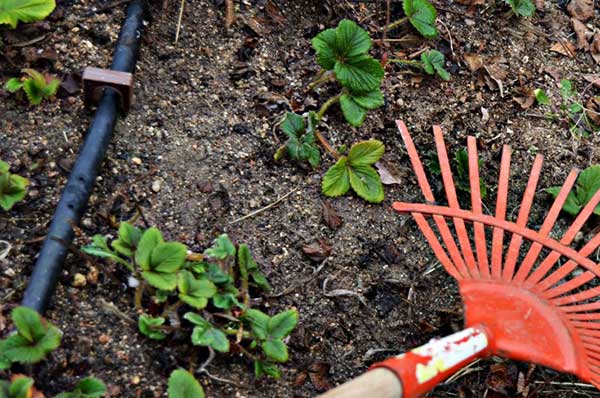 Limpiamos los bancales de fresas: en el invierno, parte de las fresas se secan y es necesario podarlas para darles fuerza (incrementar su vigor) de cara a la primavera.