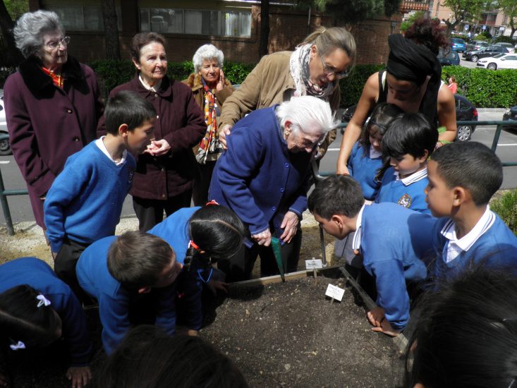 Como ya os contamos en abril, los miércoles van al huerto los abuelos y abuelas del Centro de día un ratito a cuidar su bancal. Pero durante este mes, también han venido niñas y niños del colegio San José y hemos vivido momentos muy especiales en el huerto, en los que peques y mayores han cantado y bailado, han repasado cultivos del huerto y han plantado la huerta de verano.