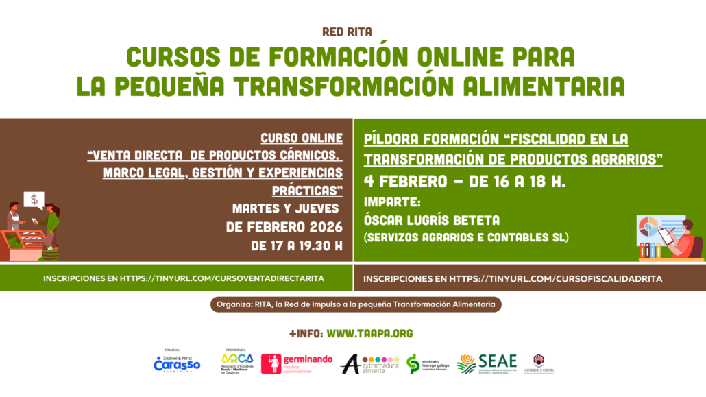 La Red de Impulso a la Pequeña Transformación Alimentaria (RITA) pone en marcha dos nuevas formaciones especializadas dirigidas a personas ganaderas, empresas e iniciativas vinculadas a la agroecología, la ganadería extensiva y la transformación alimentaria a pequeña escala. Se trata del curso ‘Venta Directa de Productos Cárnicos’, que se desarrollará a lo largo del mes de febrero de 2026 (un total de 20 horas), y la píldora formativa online centrada en los principales regímenes fiscales aplicables al sector, ‘La fiscalidad en la transformación de productos alimentarios’, que se celebrará el 4 de febrero.