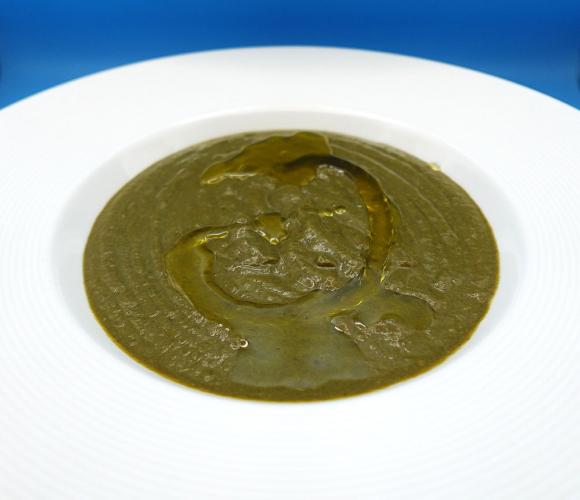 9. En un plato sopero pondremos un poco de crema y la terminamos con un chorro de aceite de oliva virgen extra.