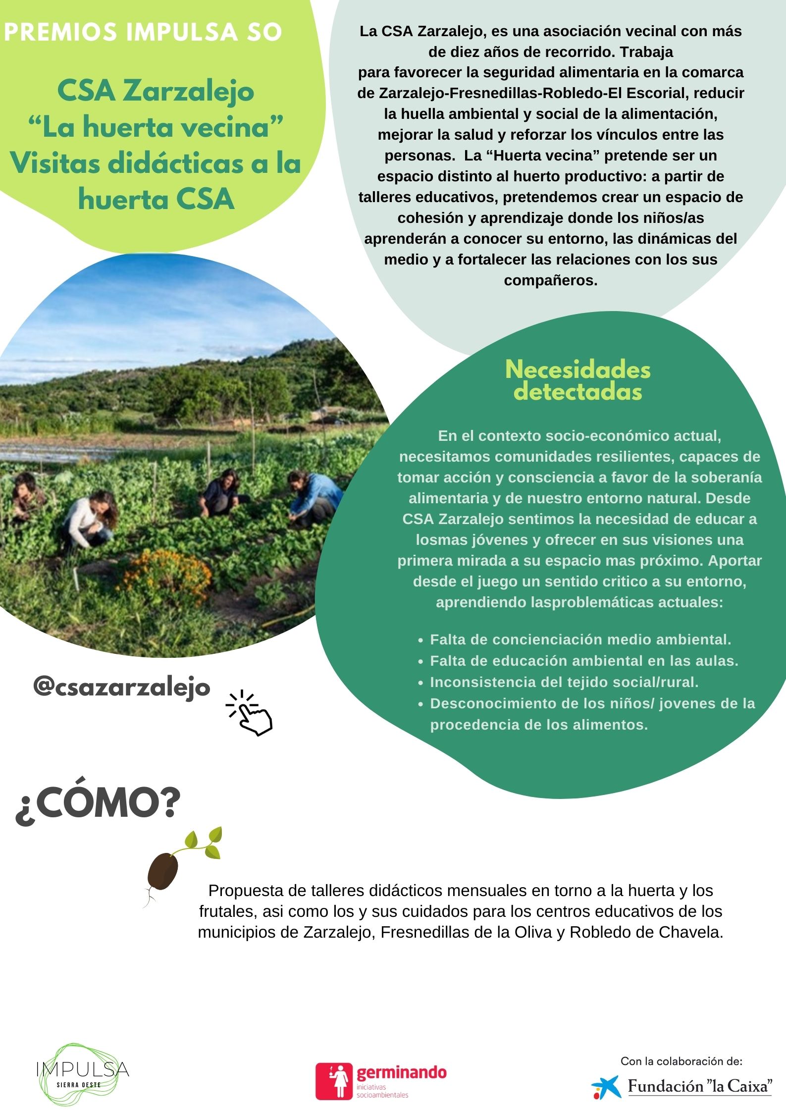 El pasado 20 de octubre, en el marco del proyecto ‘Impulsa Sierra Oeste: infancia y juventud como agentes de cambio en el territorio‘, entregamos los premios de la I Feria Impulsa Sierre Oeste, un concurso de ideas que apoyará proyectos ideados por personas jóvenes de la Sierra Oeste. Talleres juveniles ‘La Huerta vecina’ de CSA Zarzalejo, ‘Núcleo de acción social y regenerativa’ de El Arrendajo y ‘Sierra Cinematográfica’ de Alma G fueron las tres iniciativas galardonadas. ¡Os los presentamos!